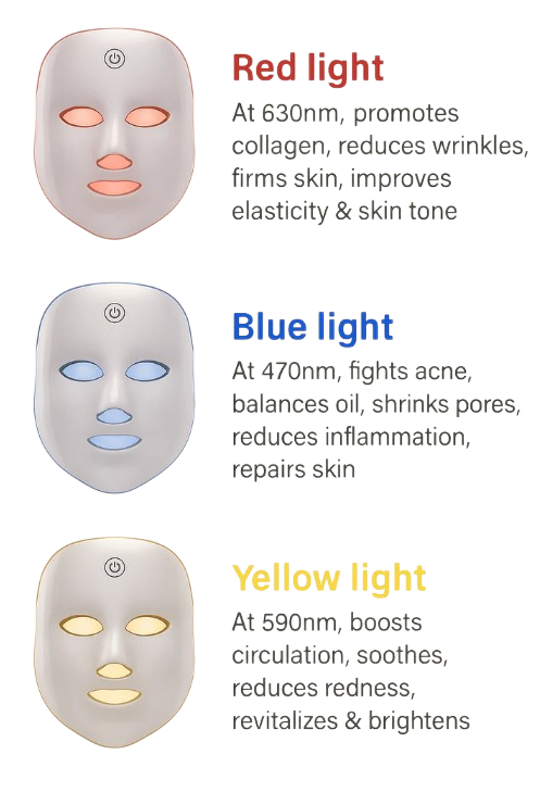 Cyan Light: Improves energy flow in skin cells, helping to revitalize tired, dull skin. It reduces puffiness and promotes a balanced complexion.