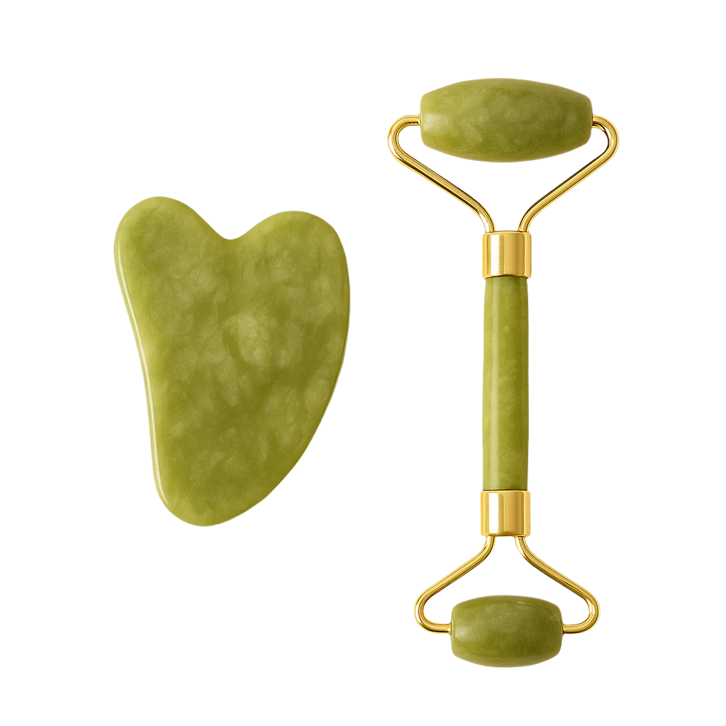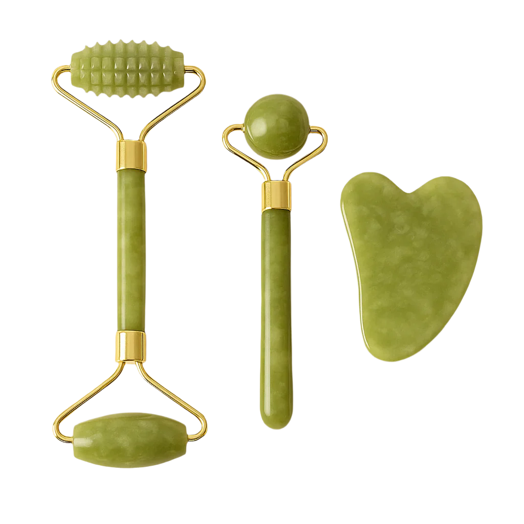 1) Jade Roller: Gently roll in upward motions on the face and neck for 10–15 minutes. Use daily with your favorite serums or moisturizers to boost absorption and skin elasticity.