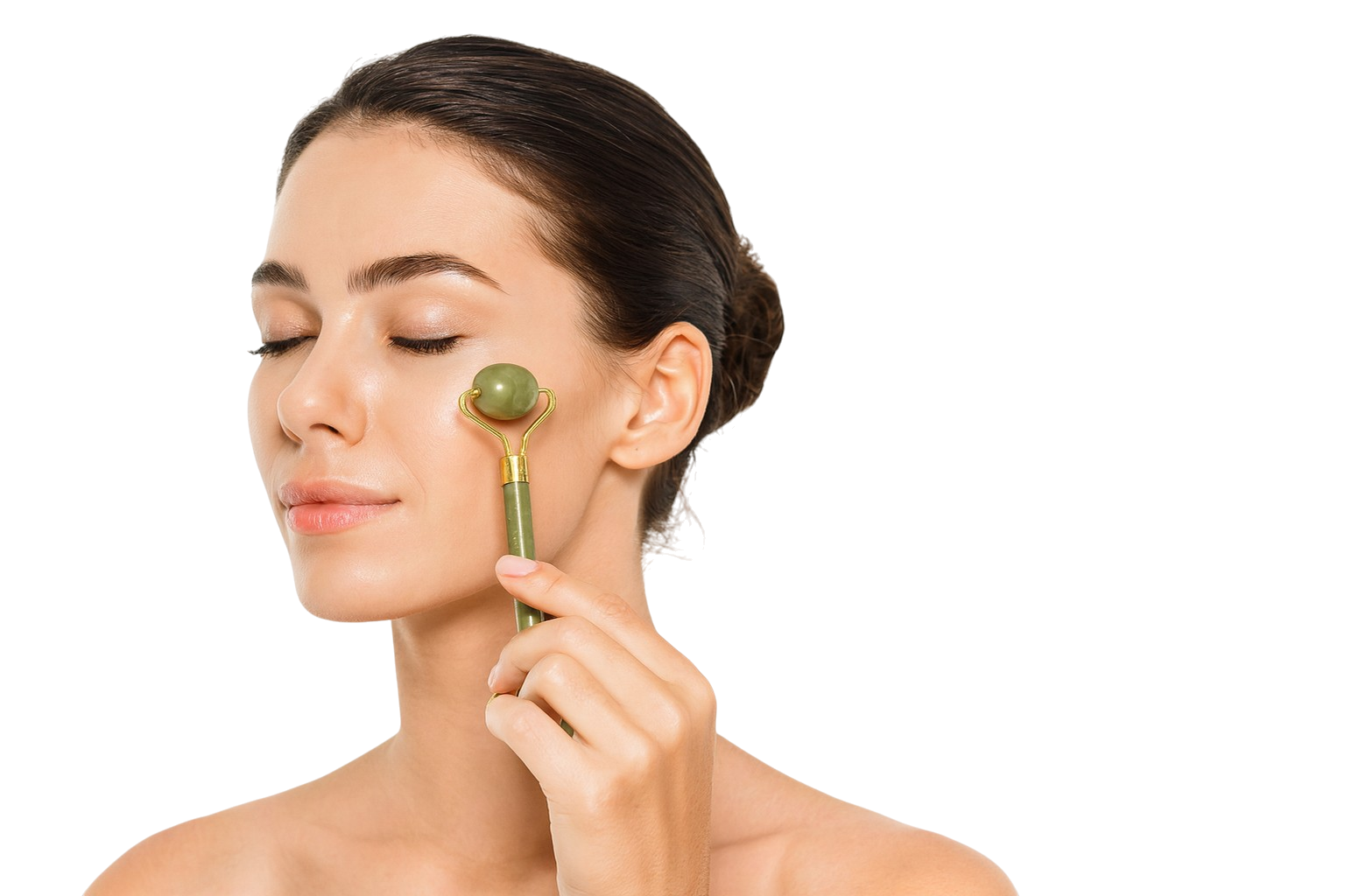 The jade roller gently glides across your skin, stimulating circulation, reducing puffiness, and encouraging lymphatic drainage for a refreshed, awakened look.